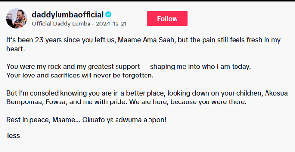 In what would become his final public reflection, Lumba shared a heartfelt tribute to his late mother, Maame Ama Saah, on December 21, 2024—marking 23 years since her passing.